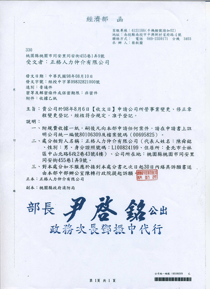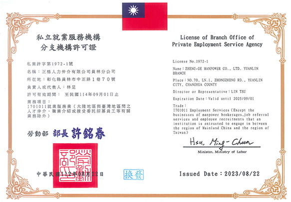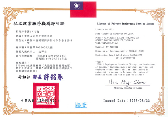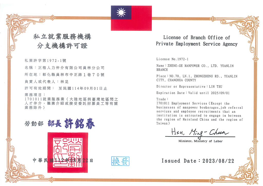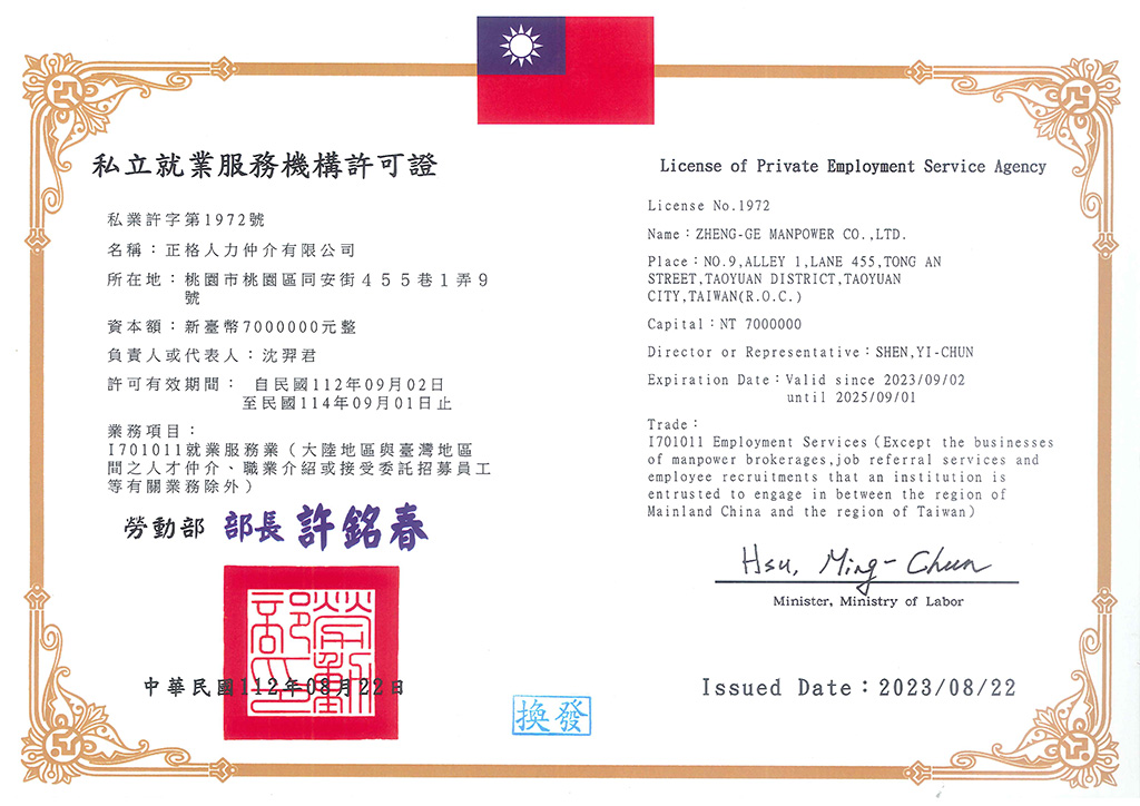 正格人力仲介有限公司積極創造全方位的服務及完善的業務諮詢為目的,並結合公司之客戶服務部、翻譯部、行政部及外務部,在董事長的統籌指導下實施多元服務及溝通協調,以促進移工無憂無慮工作,增加廠家生產力為目標;務求公司用心,勞工安心,廠家放心,以達永續經營為宗旨。