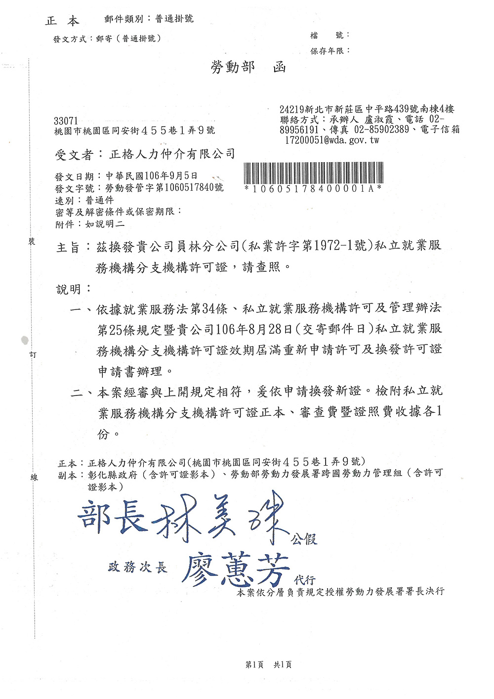 - 函送相關文件至職訓局辦理聘僱許可之展延