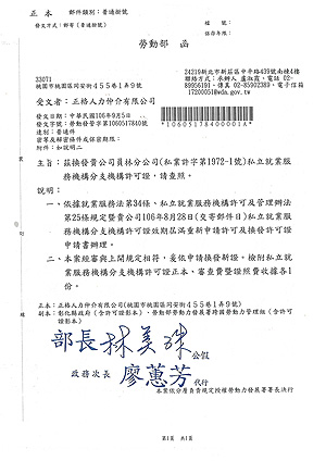 - 擁有高專業知識及管理服務經驗,完善及完整的電腦系統,將所引進的外籍勞工的個人資料,入台後各項作業的運作、跟監,文件的製件,均有完善的電腦系統控管;並將最新勞動部相關公告、法令及有關移工之最新資訊分析提供給客戶,使客戶掌握最新人力資源動態消息。
