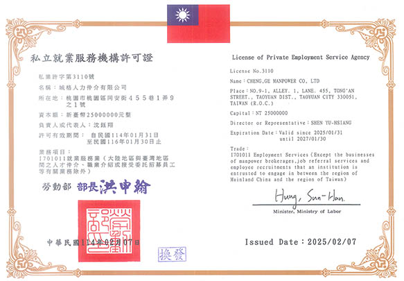 由於資訊快速發達,汎資訊化的競爭生態,使得企業間最大的優勢必須取決於人才 ,網羅優秀人才,因才適任,才能強化企業的戰鬥力,而唯有透過專業負責的人力 仲介公司,才能讓企業以最效率、經濟、整體的方式達到全方位的人才運用與發揮 。本公司是一家獲得中華民國行政院勞工委員會核發許可執照,可從事外籍勞工引進之人力仲介公司。