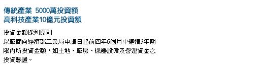 | 土地購買憑證、合約書 | 設廠或投資計劃目的 | 公司二照影本 |