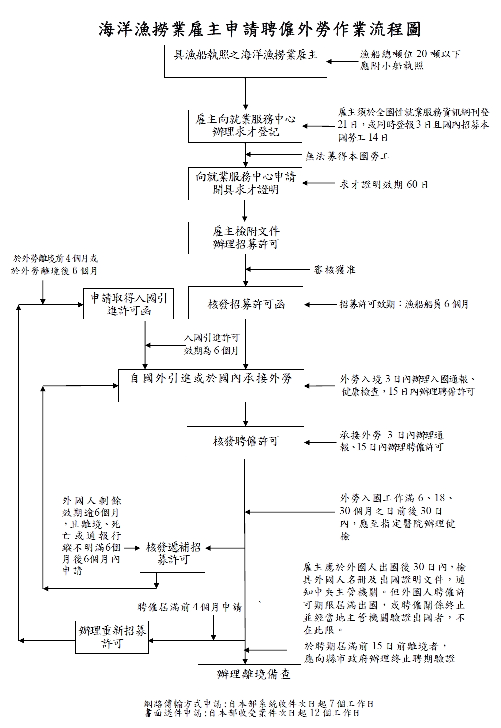 - 外國人工作地直轄市、縣(市)政府開具之雇主無違反相關勞工行政法令定證明書正本。《自開立日起60日內為有效期限》但漁船(自然人)與船員雙方如無聘僱關係者(例如採合夥制),則應檢附相關證明文件或切結書正本。